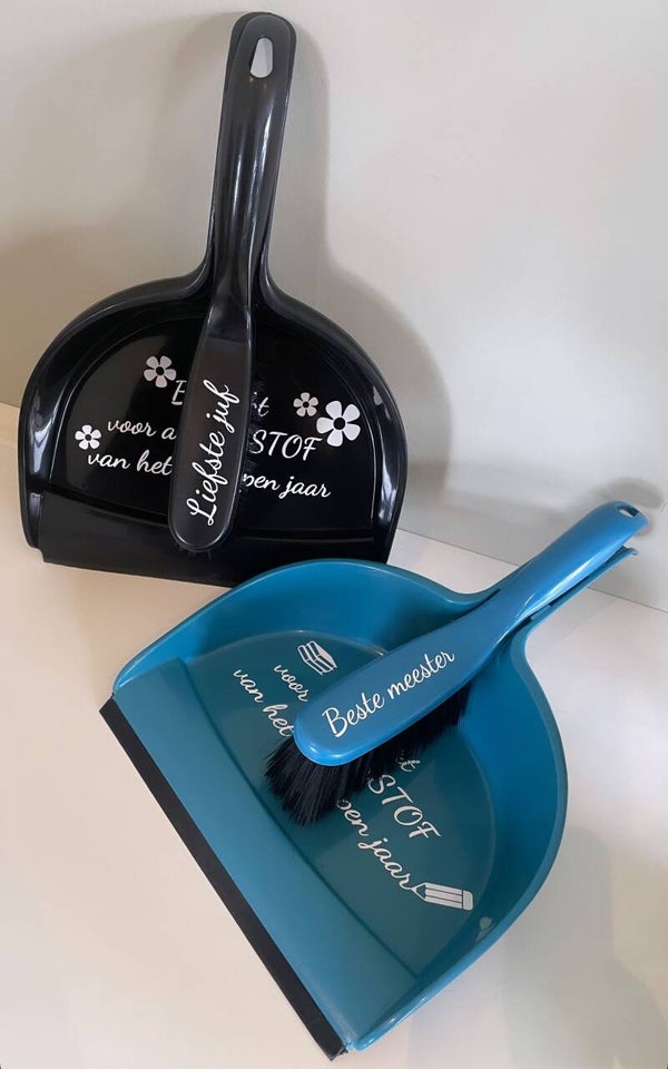 Leuk bedankje voor de juf of meester om het schooljaar af te sluiten. Het stofblik is er in het zwart, blauw en grijs.