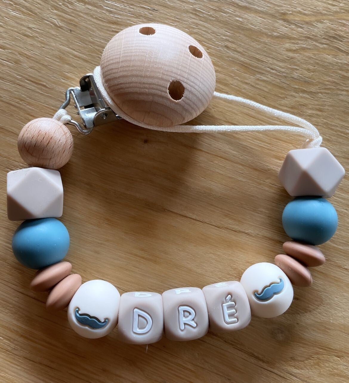 Tuttenketting met blauw, zand en latté kleurtjes, snorretjes en naam in silicone alfabet kralen in zand kleur.