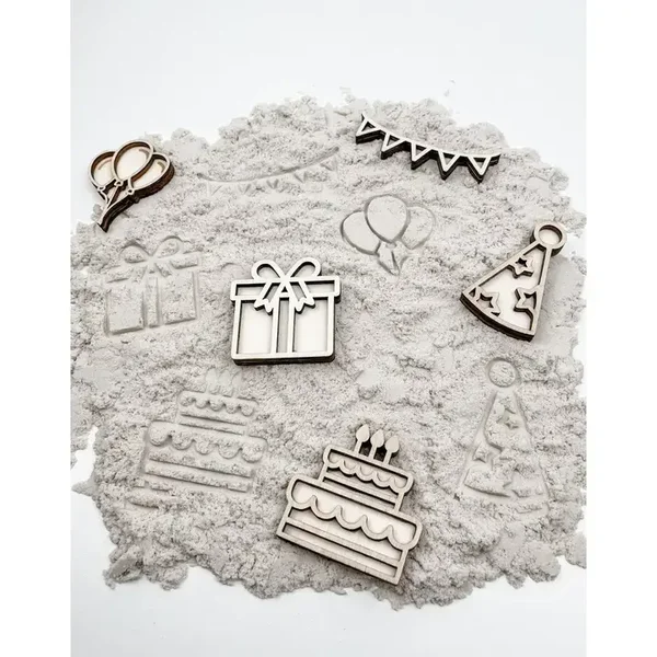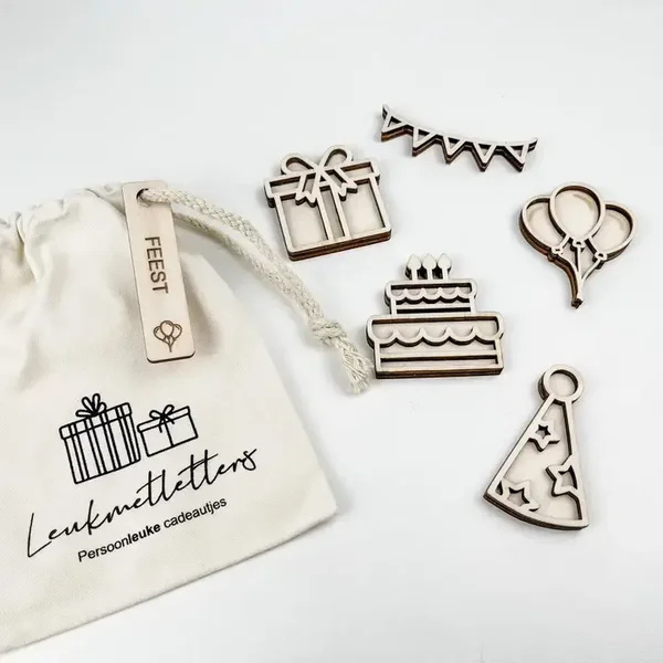 De Verjaardag set bestaat uit 5 items: cadeau, ballonnen, feestmuts, slinger en taart