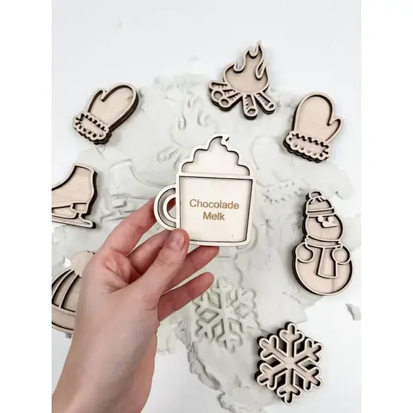 Deze set bestaat uit: schaats, muts, vuurtje, chocolademelk, sneeuwvlok, sneeuwpop en 2 wantjes